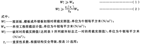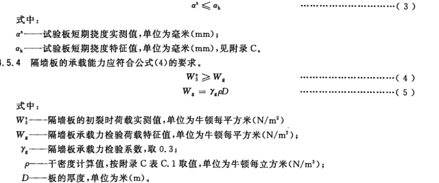 5、進(jìn)行結(jié)構(gòu)性能檢驗(yàn)的屋面板、樓板或外墻板符合公式(1)和公式(3)的要求時(shí),判該批板結(jié)構(gòu)性能合格;進(jìn)行結(jié)構(gòu)性能檢驗(yàn)的隔墻板符合公式(4)的要求時(shí),判該批板結(jié)構(gòu) 性能合格,若該板不符合有關(guān)公式的要求,判該批板不合格。